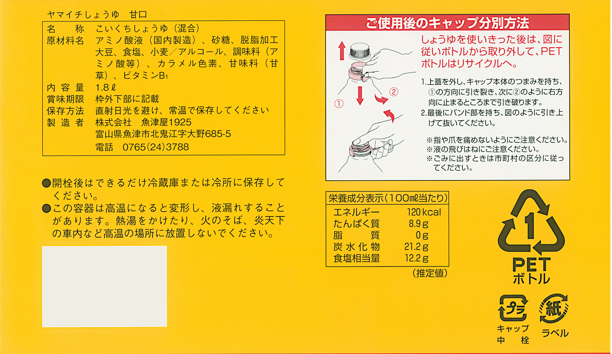ヤマイチ醤油は、地元・富山の皆様に愛用される商品です。 一般的な濃口醤油とは違い、塩味は控えめで、甘味と旨味がバランスよく感じられます。 ヤマイチ醤油「松」と比べ甘味が特徴で、後味がさらりとしています。 |